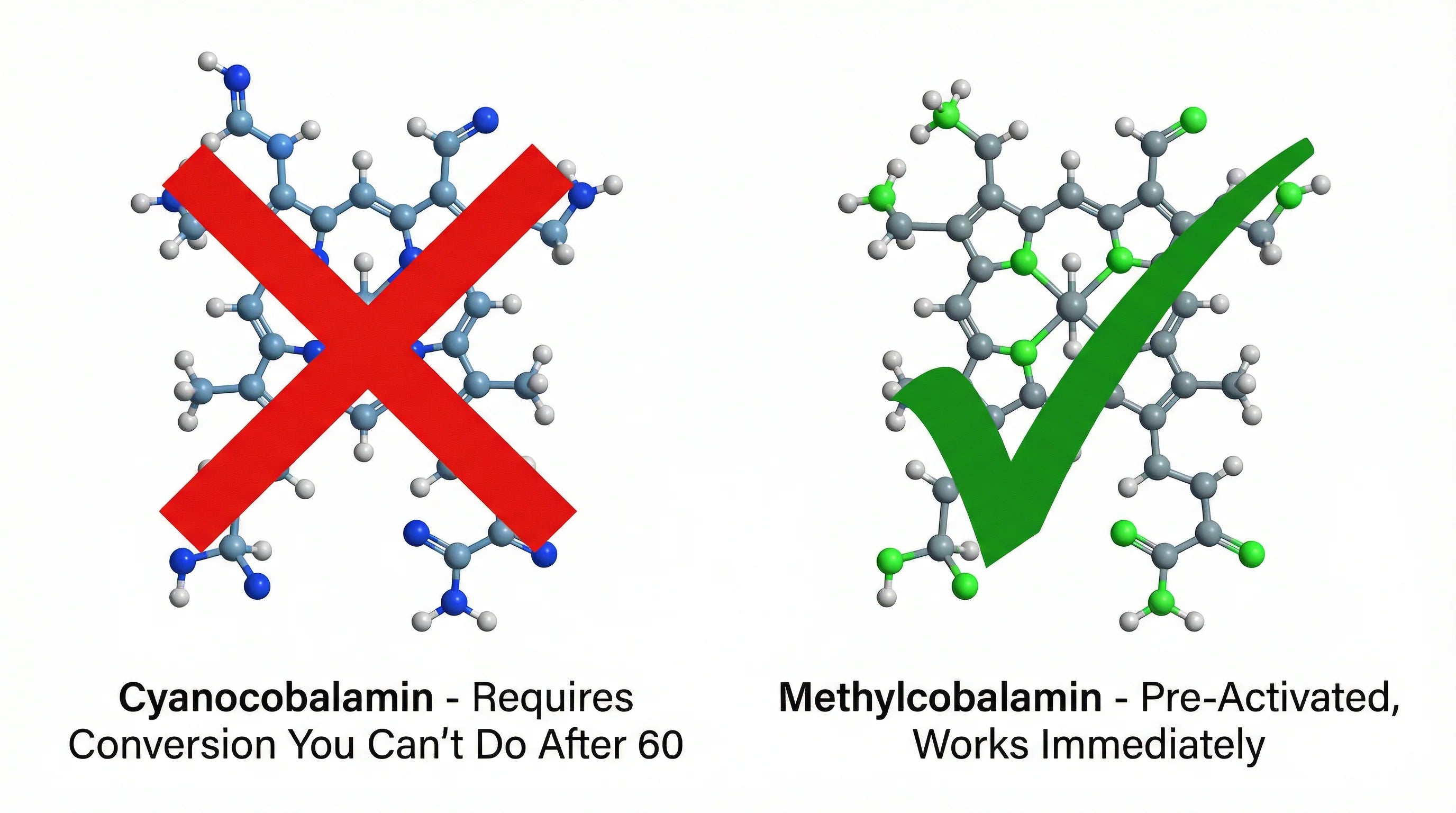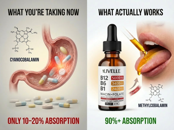 Methylated B12 is pre-activated (no conversion needed), sublingual (bypasses gut, hits bloodstream in 90 seconds), clinical strength (5000mcg not 500), and complete (B12 + B1 + ALA).